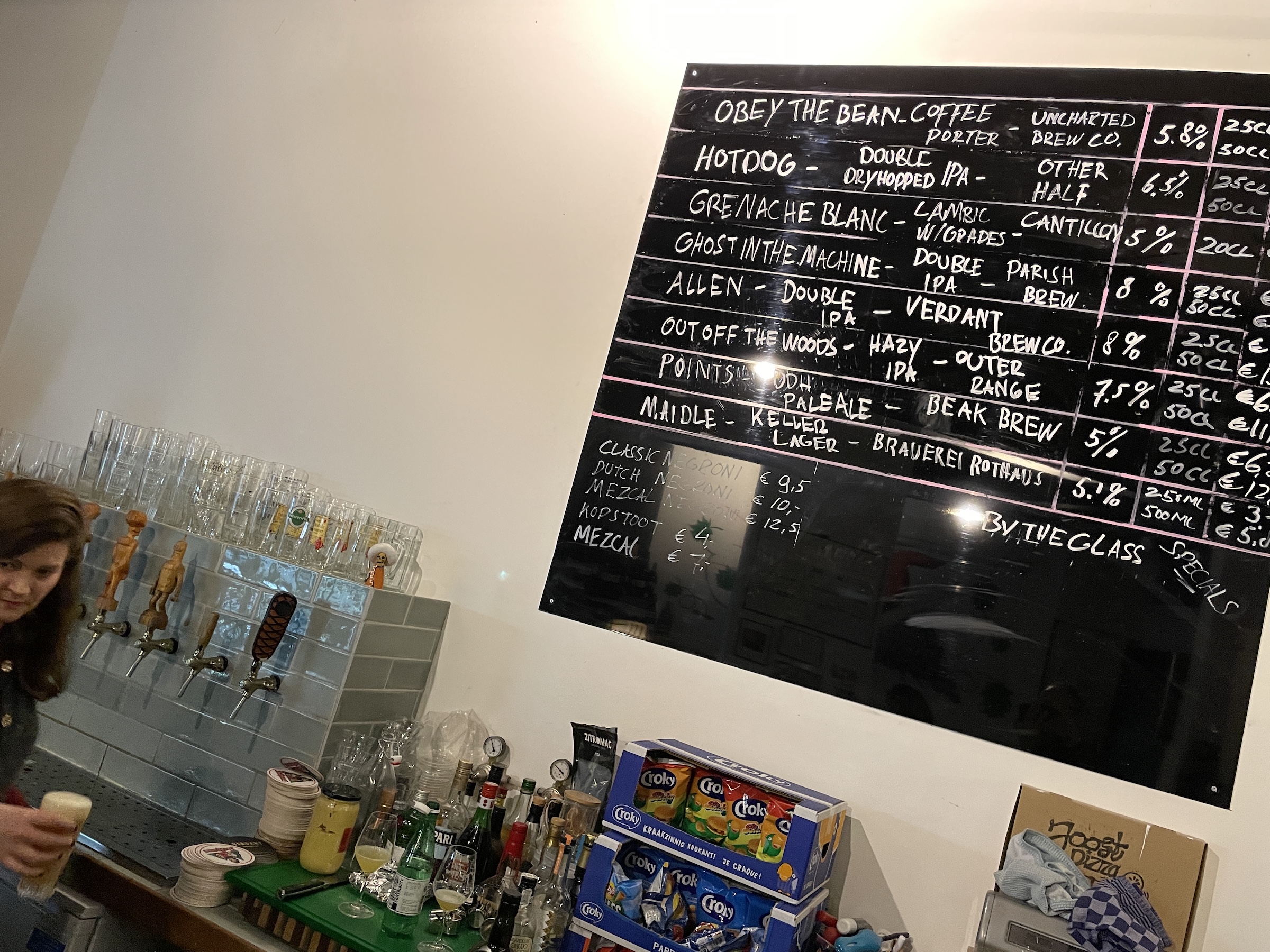 Wat hier wel lekker loopt is Nederlands bier. Kees, Frontaal, Two Chefs. Past goed bij de Spotify-playlist ‘Hollandse evergreens’ die hier uit speakers klinkt. Maar daar komt de noordelijke biertoerist natuurlijk niet voor. We drinken er een Henri (English style pale ale) en een Dipadawan V3 (DDH hazy DIPA). Nette bieren. We zijn de tweede en derde bezoekers als we binnenkomen, en bij vertrek zijn er nog altijd maar een stuk of vier tafeltjes bezet in de grote ruimte. Toch kun je het hier wel zien bruisen. Ach, iedereen zal wel bij Billies zitten.